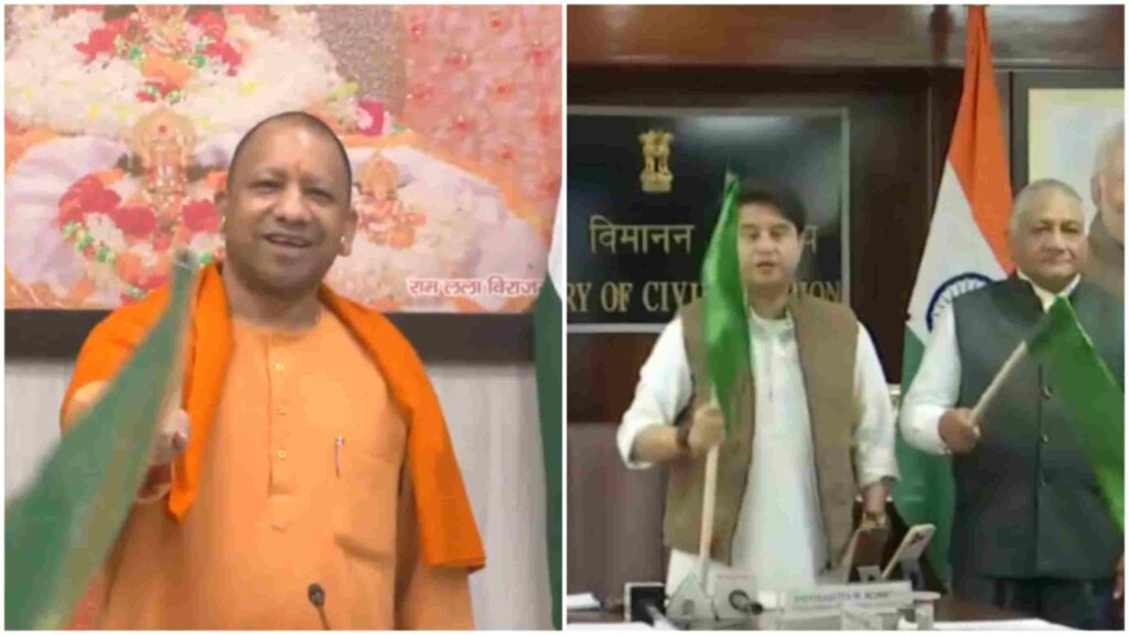 -वीडियो कॉन्फ्रेंसिंग के माध्यम से कार्यक्रम में जुड़े मुख्यमंत्री योगी ने हरी झंडी दिखाकर की वायु सेवा की शुरुआत. Good News for the travellers of Kolkata who waited for decades for a direct flight to Shri Ram Nagari Ayodhya. Super CM Yogi Ji flagged off a Direct flight today. Air and Aviation minister Jyotiraditya Scindia joined the CM in this mission through a video conference flag off ceremony.