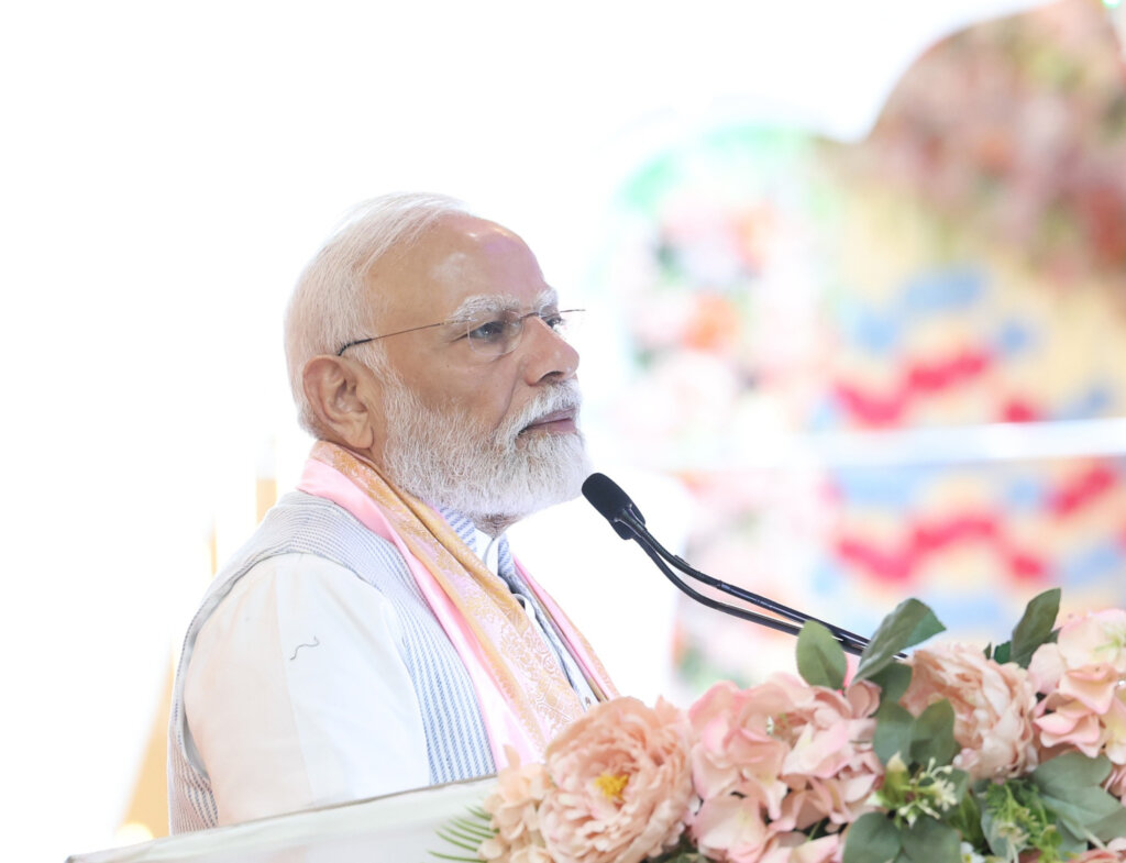 PM addressing the gathering during the visit of the Anandpur Dham, in Madhya Pradesh on April 11, 2025.